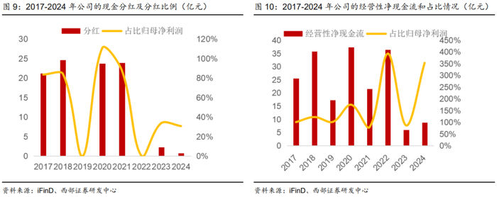 2017-2024年,公司先后经历了高分红阶段(2017-2021年)和稳定分红阶段(2023、2024年):1)2017-2021年,除了2019年因为归母净利润下滑较多没有分红以外,其他年份分红比例均在80%以上,2017、2018、2020、2021年分红金额分别为21.22、24.65、23.72、23.93亿元,占比归母净利润分别为83.54%、84.22%、110.84%、87.59%;2)2022-2024年,其中2022年未分红,2023、2024年分红金额分别为2.33、0.76亿元,占比归母净利润分别为33.82%、30.78%。经营性净现金流较为稳健:2017-2024年,除了2021和2023年经营性净现金流占比归母净利润低于100%(分别为78.84%和86.21%),其他年份均高于100%。