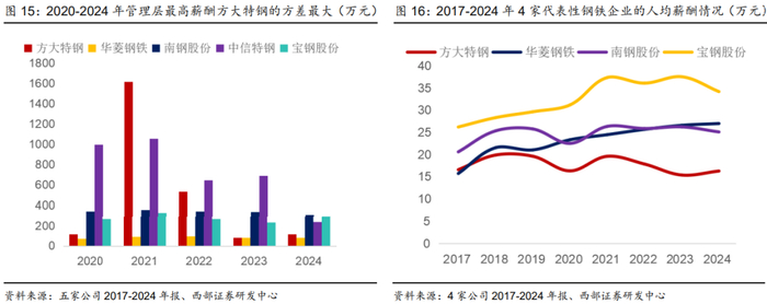 核心管理层薪酬激励弹性大、员工薪酬和业绩直接挂钩。1)我们梳理2020-2024年5家钢铁企业管理层的薪酬情况,在最高薪酬方面,2020-2024年,方大特钢分别为114.91、1613.51、528.58、79.40、114.98万元,2021年是近5年来钢铁行业盈利的高峰,2023和2024年是钢铁企业盈利的底部,可见公司高管薪酬和激励弹性较大(体现为最高薪酬的方差较大);而其他4家钢铁企业管理层的最高薪酬则较为平稳。2)员工人均薪酬方面,2017年方大特钢为16.51万元,2021年(钢铁企业盈利巅峰)为19.54万元,涨幅为18.34%;到2024年(钢铁企业盈利底部)为16.20万元,降幅为17.08%,员工薪酬显著和业绩挂钩,上下均可浮动。而其他3家钢铁企业(剔除中信特钢,2018年人均薪酬数据有较大扰动),2021年相比2017年薪酬涨幅分别为华菱钢铁56.13%、南钢股份28.03%、宝钢股份42.75%;2024年相比2021年涨幅分别为华菱钢铁10.31%、南钢股份-4.77%、宝钢股份-8.51%,员工人均薪酬体现出易涨难降的特点。