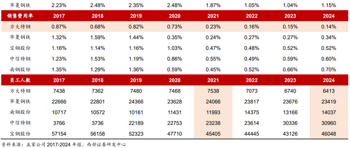 1)管理:与钢铁行业头部企业相比,公司作为民营企业,机制灵活,销售费用率低,核心管理层薪酬激励弹性大、员工薪酬和业绩直接挂钩;