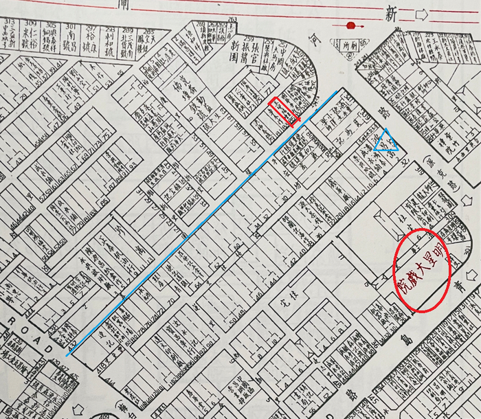 1940年代后期酱园弄附近,蓝线为新昌路432弄的酱园弄,两端分别通往新昌路和黄河路;红色方框处即85号的案发地点,一楼是王燮阳命相馆;蓝色三角为詹云影曾经工作过的新闸路329号鸿昌当铺;红圈处为第七保办事处