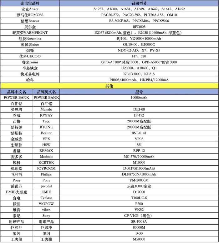 充电宝召回型号涉及30多个品牌