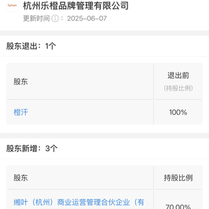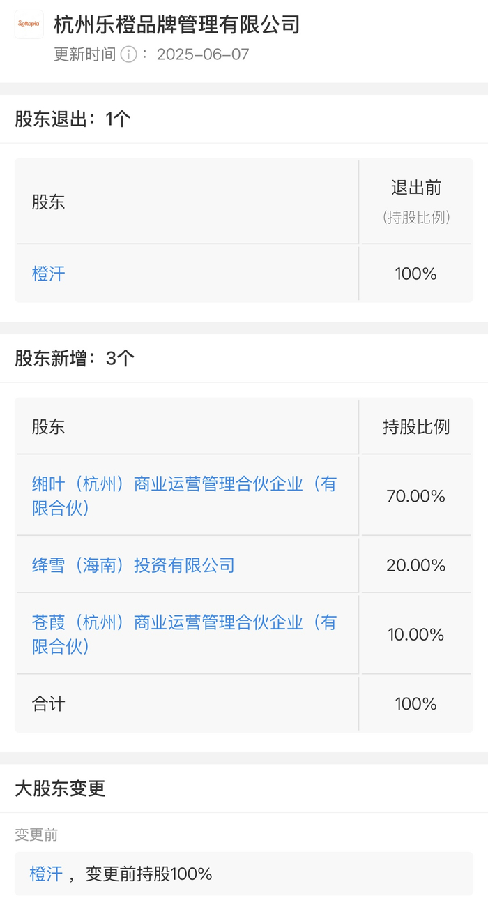 “超级元气工厂”隶属于杭州乐橙品牌管理有限公司(下称“乐橙”)。今年6月,乐橙刚刚进行了股权变动:曾持股100%的公司董事橙汗退出,同时新增缃叶(杭州)商业运营管理合伙企业(有限合伙)、绛雪(海南)投资有限公司、苍葭(杭州)商业管理运营合伙企业(有限合伙),持股比例分别为70%、20%和10%。