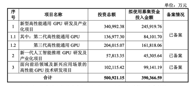 招股书表示,本次IPO拟募集资金39.04亿元,主要用于投资“新型高性能通用GPU研发及产业化项目”、“新一代人工智能推理GPU研发及产业化项目”和“面向前沿领域及新兴应用场景的高性能GPU技术研发项目”。