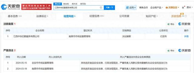 此外,该公司因其他违反食品安全法律、行政法规规定,严重危害人民群众身体健康和生命安全的违法行为,分别被南昌市市场监督管理局、吉安市市场监督管理局列入严重违法失信企业名单。