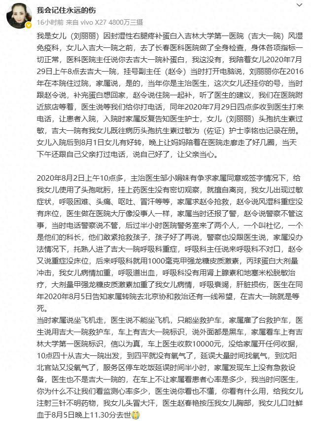 2025年7月1日晚,刘丽的家属 @我会记住永远的伤 发文称, 自己的女儿(刘丽丽)因风湿性右腿疼补蛋白入吉林大学第一医院风湿免疫科,注射了头孢类药物后出现过敏症状,呼吸困难、头痛、呕吐、冒汗等等。医生告知家属转院去北京协和救治,家属称转运的救护车涂装了医院标识,收款10000元没开收据,途中两次氧气不够到处找氧气,且在服务区停车吃饭延误半小时,途中患者去世。