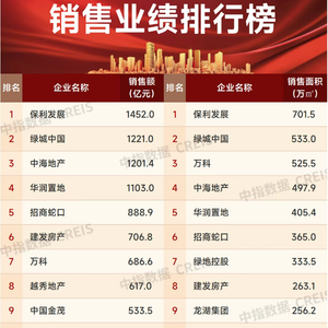 从企业排名来看,保利发展、绿城中国、中海地产销售额位居前三,分别录得1452.0亿元、1221.0亿元以及1201.4亿元;华润跟招商蛇口紧跟其后,为1103.0亿元、888.9亿元。