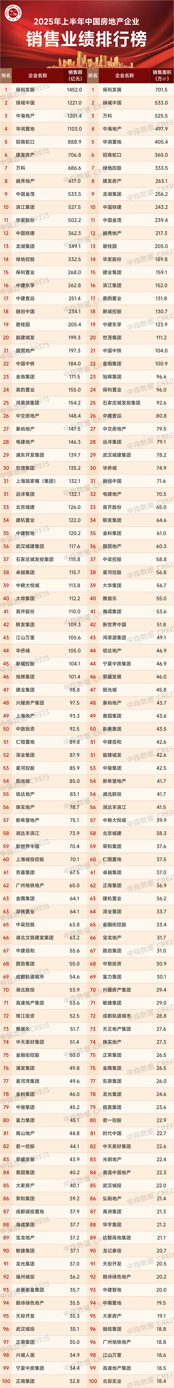 特别声明:房地产企业销售数据统计是以2025年1月1日-6月30日期间销售的商品房为统计口径,主要依据中指数据CREIS在各地的销售监测数据,并参考当期总体经营情况和推盘去化情况进行分析统计;对于少数没有在监测范围内的城市或项目,由企业提供相关证明文件,经课题组对数据进行严格审核,也纳入统计范围。本报告仅供参考,课题组不对使用报告及其内容所引发的任何直接或间接损失承担责任。