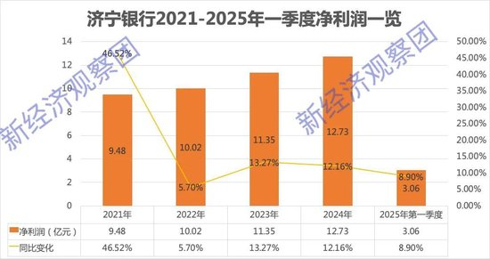 与营收的强势增长相比,济宁银行的净利润也在增长,但波动较大。2021-2024年,该行净利润分别实现9.48亿元、10.02亿元、11.35亿元和12.73亿元,其中2021年增速高达46.52%,2022年增速缩水至5.7%,随后两年保持了双位数增长。但进入2025年后,盈利态势有略回落至8.90%,净利润为3.06亿元。