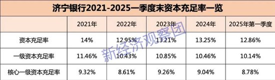 2021年至2025年一季度末,济宁银行的资本充足率分别为14%、12.95%、13.21%、13.25%和12.86%,一级资本充足率分别为11.46%、10.43%、10.85%、10.46%、10.14%;核心一级资本充足分别为9.32%、8.61%、9.26%、9.04%、8.78%。