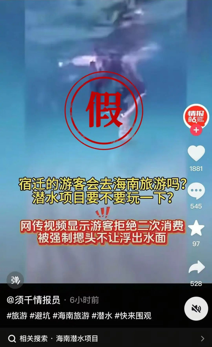 三亚市旅游服务中心在辟谣中表示,近期,今日头条、抖音等平台出现“三亚潜水教练反复把女孩压向水底”等相关内容,引发关注。该不实信息严重误导公众认知。对此,该中心第一时间联合公安、旅文等多部门成立专项调查组,开展全面核查工作。