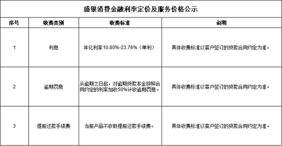 根据盛银消金官网公布,其产品年化利率10.8%-23.76%,罚息上,从逾期之日起,对逾期贷款本金按照合同约定的利率加收50%计收逾期罚息。