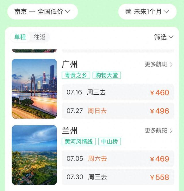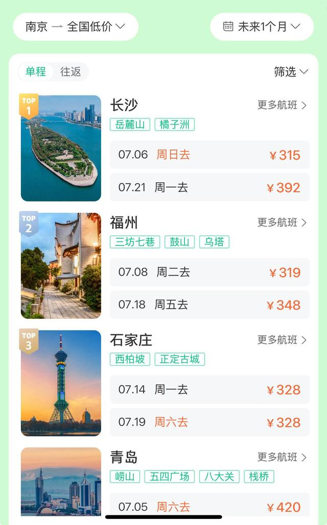 旅游者出行都希望能购得最优惠价格的机票,记者查询网站发现,从南京出发到长沙,7月6日的机票价格仅为315元。7月8日,南京到福州机票价格为319元。记者注意到,从南京到石家庄328元,到广州、青岛、广州、兰州、大连等主要旅游城市的最低机票价都在400多元左右。
