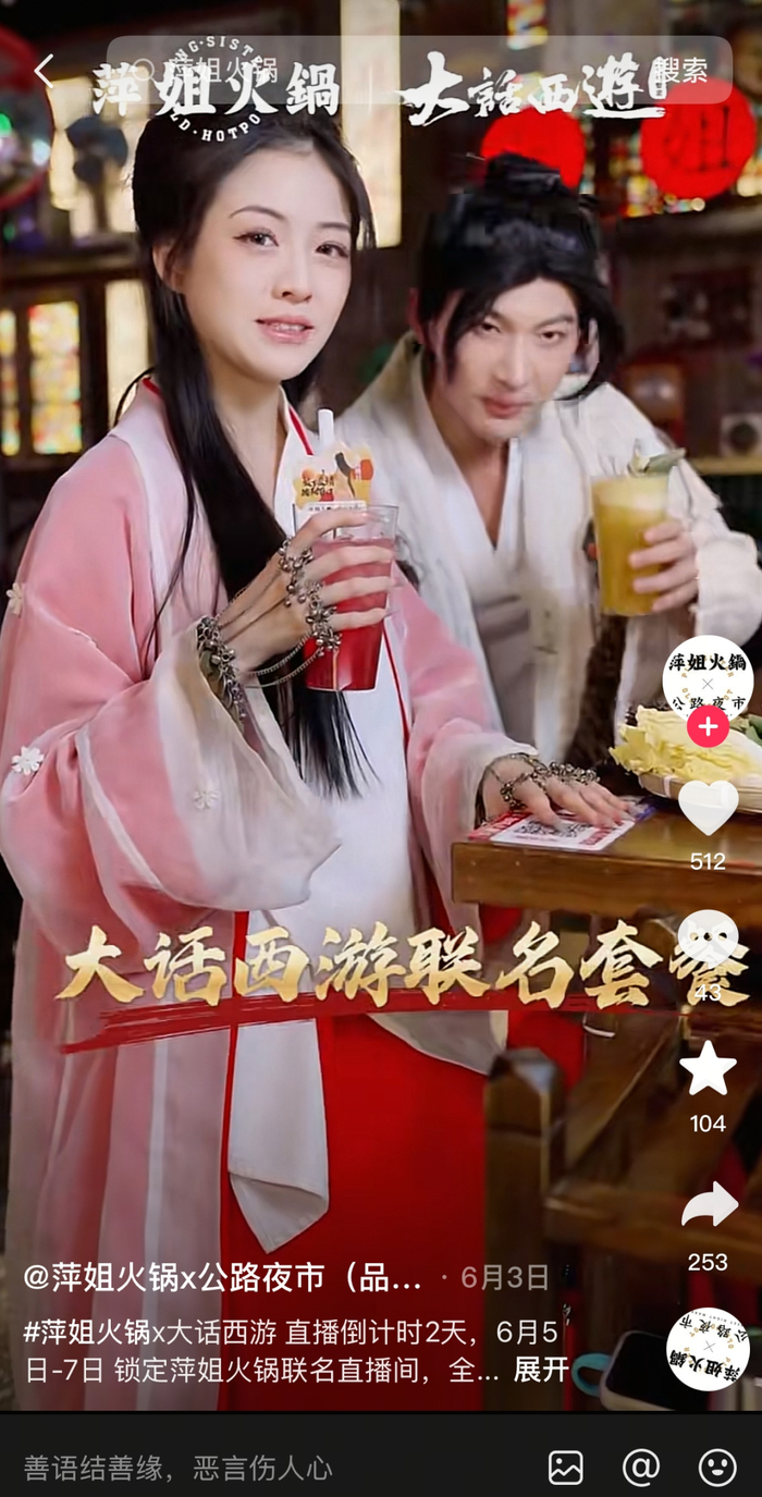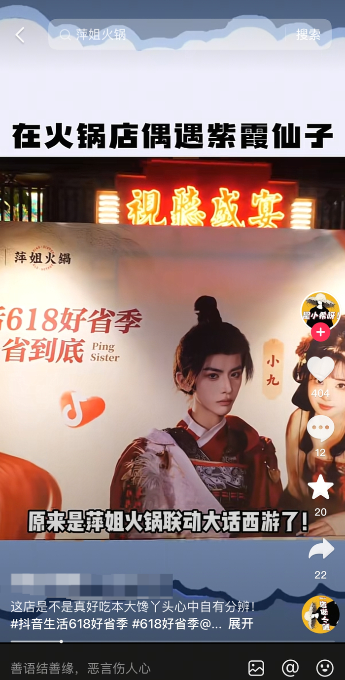 此次联名了大话西游IP的萍姐火锅,就将网红coser请到了线下主题店与顾客互动,让门店增添了更多活动氛围,为就餐的顾客提供更多情绪价值。在线上的抖音直播间,品牌也请来紫霞仙子、白晶晶、牛魔王等IP角色空降直播间,用沉浸式地场景化直播,让购物成为一种享受。