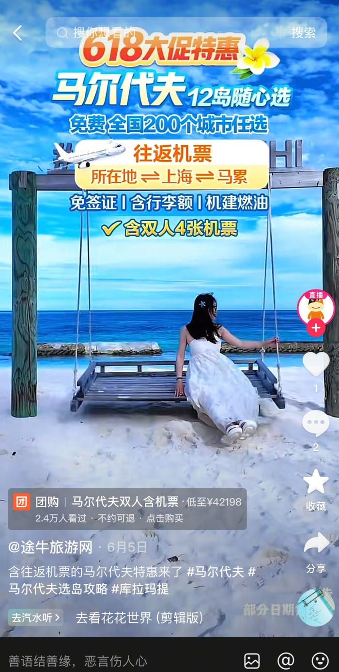 长隆、迪士尼、马尔代夫,是途牛此次618选择聚焦的产品。它们适合暑期亲子游、相对应季,而且主打游玩体验和美景,天然地适合实景直播,可以让观众更直观地感知其差异化体验。据了解,马尔代夫旅游券,就是途牛为此次618专门定制的产品。高品质+高优惠的商品,为途牛在直播中做好内容,奠定了基础。