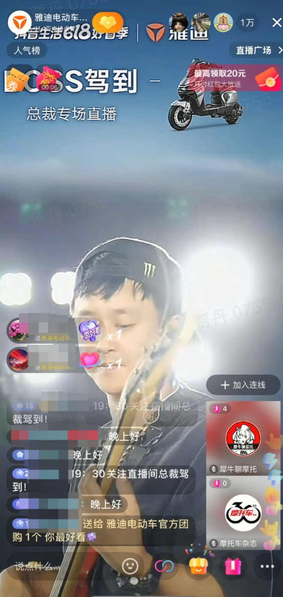 除了Boss下场讲解之外,雅迪还把摇滚乐队请到直播间,让直播既是销售场,又带来视听享受,打动更多兴趣人群。这些直播创新玩法,不仅让用户感到品牌的诚意、产生更多信任感,也让他们更清晰全面地了解产品,买得更放心。