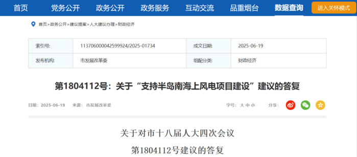 市生态环境局:“我局已分别于2024年5月21日、2025年1月17日出具了国家电投烟台半岛南3号二期和国家能源山东半岛南1号海上风电项目选址支持性意见。下步,我局将积极配合发改部门,根据建设单位提报的申请材料和场址坐标,对半岛南5号海上风电项目选址进行审核,并依法依规做好后期项目环评审批服务。”