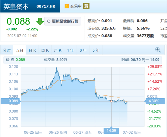 截止日前,港股英皇国际暴跌近20%,报0.199港元,总市值11亿港元。