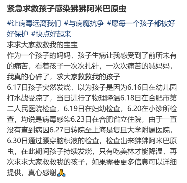 近日,一名男童的妈妈在社交平台上发帖求助,称孩子6月16日在幼儿园打水仗后,第二天开始持续发烧,多家医院检查后一直没有查到病因。