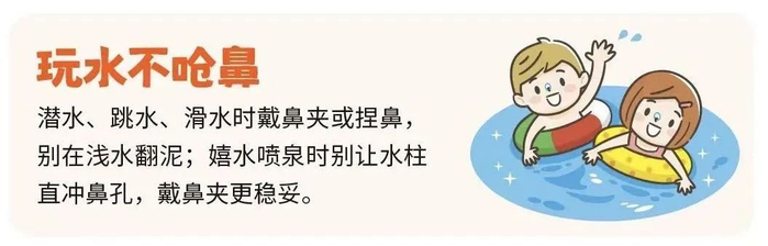 夏天在湖泊、温泉、河道、戏水池潜水、跳水,鼻腔被温暖的淡水猛冲,就是最典型的感染途径。同时自来水直接洗鼻也可能感染。夏日玩水时一定要注意这些细节: