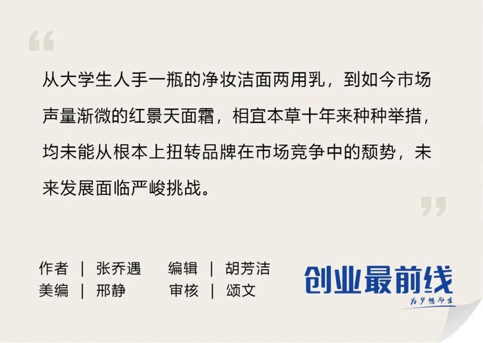 从大学生人手一瓶的净妆洁面两用乳,到如今市场声量渐微的红景天面霜,相宜本草的十年变迁折射出老牌国货的转型困境。从长期市场表现来看,相宜本草十年来种种举措均未能从根本上扭转品牌在市场竞争中的颓势,未来发展仍面临严峻挑战。