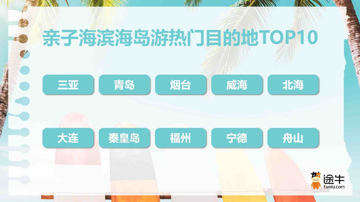 海滨海岛目的地是亲子家庭亲水避暑的热门选择。途牛截至目前最新预订数据显示,三亚、青岛、烟台、威海、北海、大连、秦皇岛、福州、宁德、舟山等海滨海岛目的地备受亲子家庭青睐。