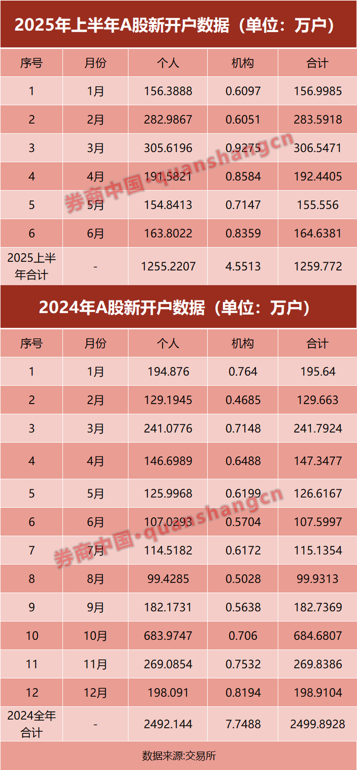 数据显示,今年6月A股新开户约165万户,其中,个人投资者开户163.8万户,机构投资者开户0.84万户。今年6月A股新开户约165万户,比5月新开户数156万户略增长6%,不过,比2024年6月A股新开户数107.6万户大幅增长53.35%,远超去年同期的开户水平,且高于2024年全年中的6个月份单月开户数据。