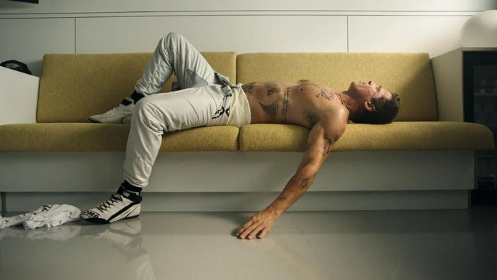 如果将皮特上部运动题材片《点球成金》,视作和数学公式沉着、智慧的周旋,《F1》里的海耶斯,更像是个率领突击队一路挺进的游戏高手。针对这个军师型角色,皮特在表演时设计了一些简约的记忆点,如用冰水洗脸、泡冰桶来帮助舒缓和思考,以及喜欢在上场前随身揣张扑克牌,作为“幸运符”。