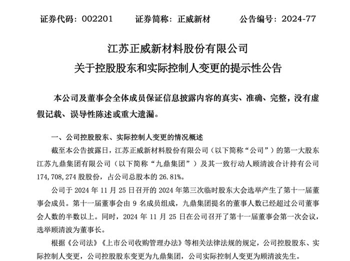 2024年11月25日,正威新材公告称,公司选举产生了第十一届董事会成员,由9名成员组成,其中九鼎集团提名的董事人数已超公司董事会人数的半数以上。同日,正威新材还选举顾清波为董事长,董秘也更换为九鼎集团副董事长的缪振。