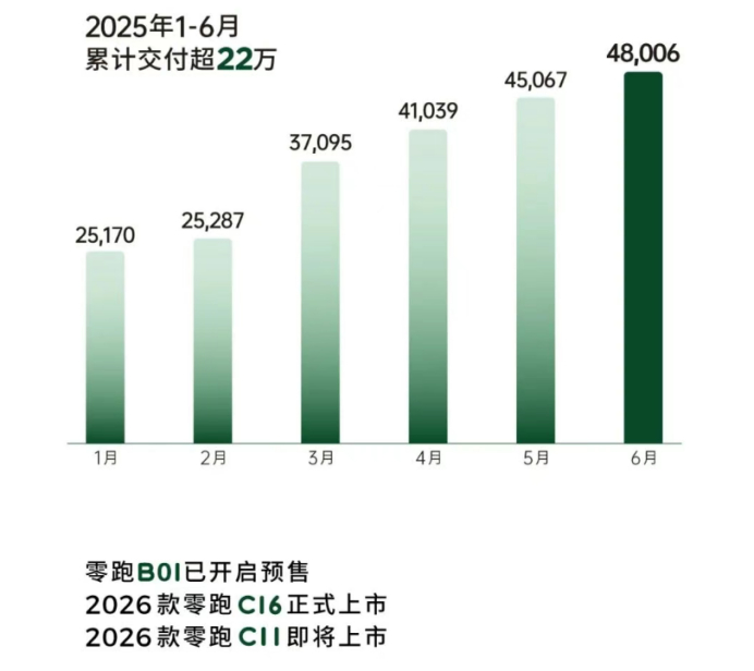 在2025年6月,零跑销量达48006辆,同比增长超138%,连创历史新高,累计交付已经超过80万辆。