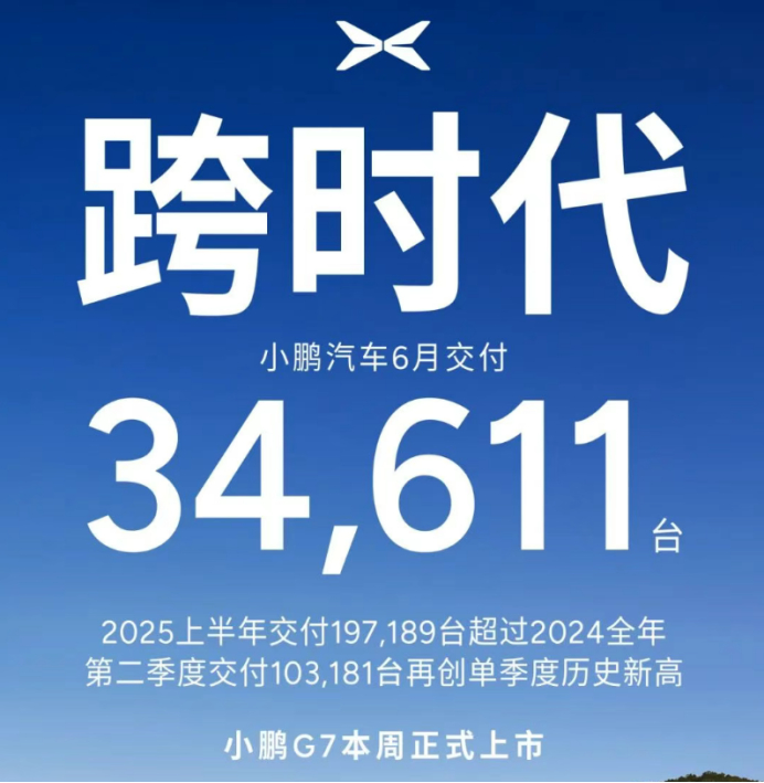 在2025年6月,小鹏汽车共交付新车34611辆,同比增长224%,已经实现连续8个月交付量超3万辆。在今年1-6月,累计交付已达197189辆,超过2024年全年交付量。
