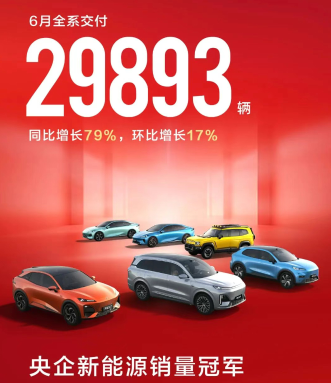 2025年6月,深蓝汽车交付达29893辆车,同比增长79%,环比增长17%,稳居央企新能源销量冠军。