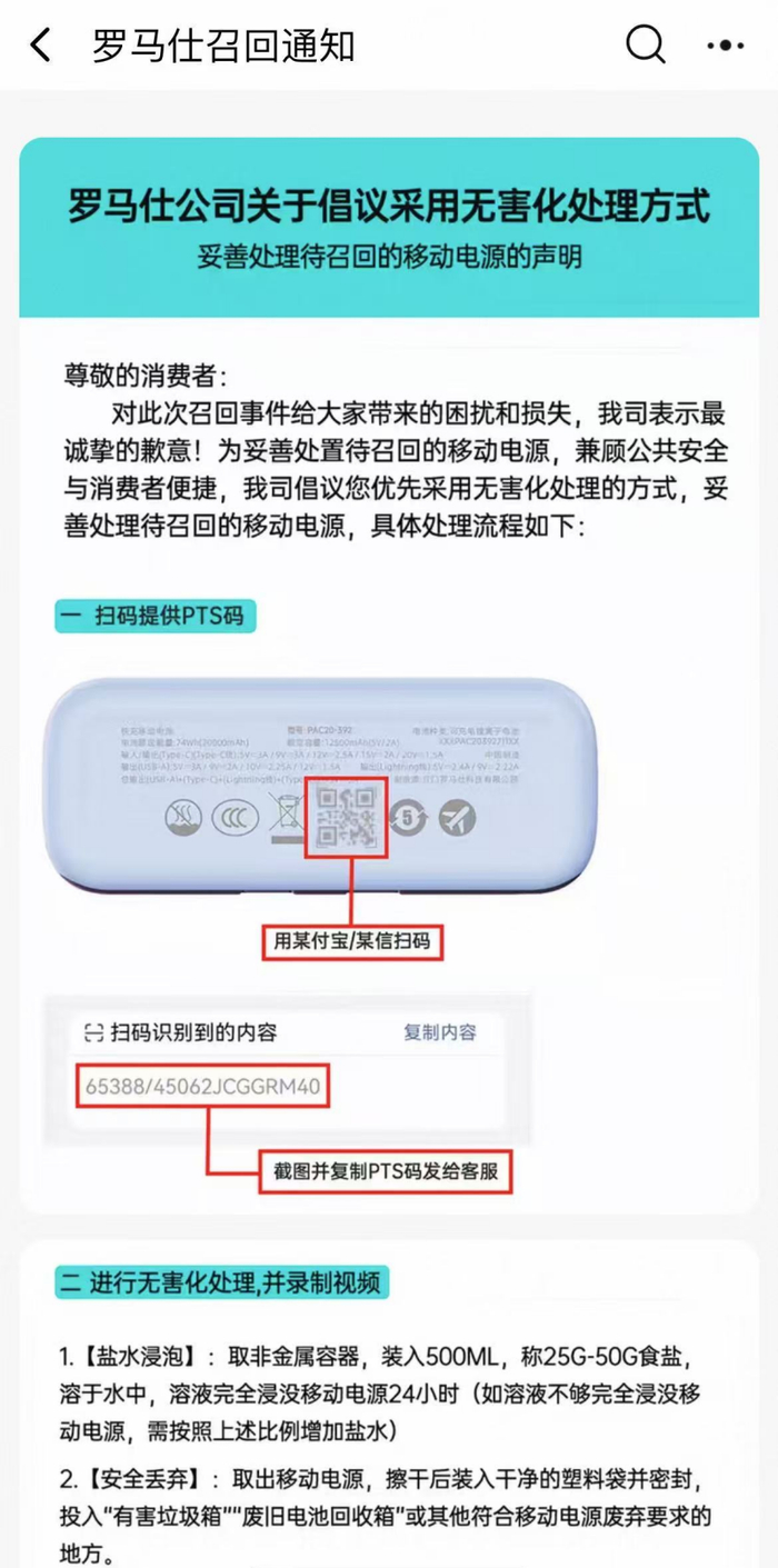 至于召回流程,罗马仕给出的一个方法是扫码提供PTS码并联系客服登记,另一个则是“无害化处理”,将移动电源置于盐水中浸泡24小时。罗马仕表示,在收到上述PTS码和无害化处理视频后,将在10天内进行审核并退款,原路退回或者退至指定账户中。