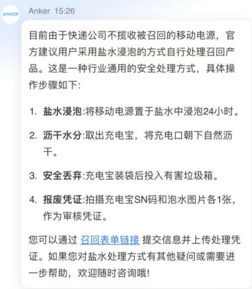 据安克创新客服介绍,这是一种行业通用的安全处理方式。然而,部分消费者质疑“盐水浸泡”是否有效,担心浸泡过充电宝后的盐水有害。