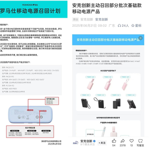 6月中旬左右,罗马仕、安克创新(300866.SZ)相继发布公告,召回存在安全隐患的移动电源产品。随后,民航局也发布紧急通知,加强对不合规充电宝的检查。
