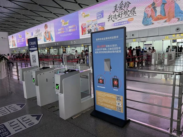 6月28日中午,记者走访南宁吴圩国际机场,看到在航站楼入门安检处、值机区域以及安检通道等显眼位置,均增设了携带充电宝新规的告知牌,机场各家快递公司是否收寄充电宝的规则也不一样。