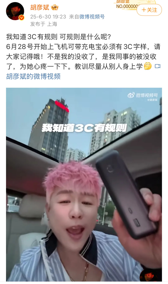 有消息称“胡彦斌疑似充电宝被机场没收”