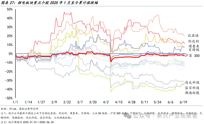 2025年年初至今,板块重点公司比亚迪(+20.4%)、科达利(+11.1%)、璞泰来(+7.7%)、贝特瑞(+6.9%)股价上涨并跑赢沪深300指数(-2.2%);宁德时代(-9.7%)、亿纬锂能(-10.0%)、天齐锂业(-11.1%)、赣锋锂业(-12.6%)、中伟股份(-14.0%)、天赐材料(-15.7%)、恩捷股份(-17.8%)、尚太科技(-32.5%)、容百科技(-34.4%)、湖南裕能(-34.6%)股价下跌。