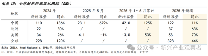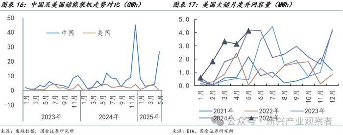 我们在2025年中期策略中预测,中国/欧洲/美国/全球新增容量的同比增速分别为11%/63%/70%/44%。2025年1~5月国内累计同比增速达125%,显著高于预测值,这一增长主要源于“531”节点临近,新能源项目集中并网需求释放,以及地方政策的激励;其中电网侧储能持续主导新增装机市场,5月新增5.0GW/11.6GWh,同比+219%/261%。美国5月储能并网4.1GWh,同比-1%、环比+32%;1~5月累计装机13.0GWh,累计同比+53%,维持相对稳定。