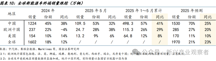2025年5月,全球新能源车市场表现再度超预期,尤其国内及欧洲市场强劲增长。据乘联会等数据,5月中国/欧洲十国/美国新能源车销量分别达到109.5/24.7/13.2万辆,同比增速分别32%/38%/6%,渗透率达53%/28%/9%。