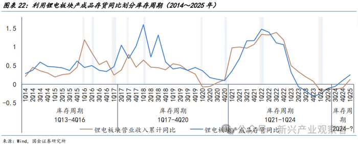 板块所处库存周期阶段:我们在2024年~2025年策略报告中即提到,锂电板块正经历库存周期触底至回升阶段,当前板块自2Q24正式进入复苏阶段,3Q24~1Q25为板块繁荣期,对应库存周期为“被动去库”至“主动补库”阶段。