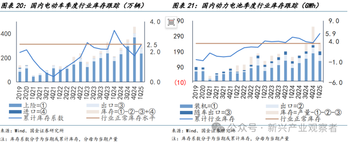 2025年一季度电动车、动力电池库存水平提升。我们通过电动车及电池产量及需求测算行业季度库存水平,4Q25~1Q25,电动车/电池库存系数分别由1.7/3.7触底,回升至2.5/5.9,其中动力电池库存位于合理水平(3.5)上方、电动车库存水平(2.5)合理。根据乘联会崔东树,新能源经销商厂家和渠道库存明显上升,行业库存总体压力逐步加大。