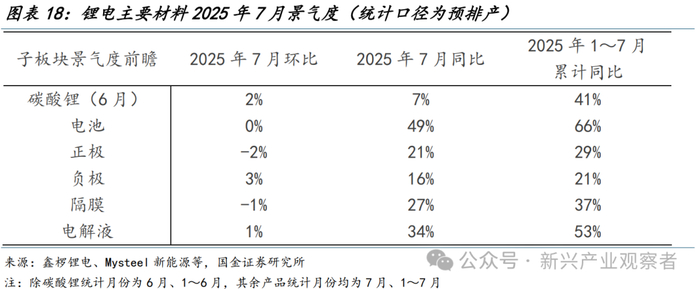 7月锂电排产跟踪:环比变动-2%~3%,同比增长7%~49%。2025年1~7月,碳酸锂/电池/正极/负极/隔膜/电解液预排产累计同比预计达21%~66%,其中单7月电池、电解液同比超30%;正极、隔膜排产环比小幅调整,主要系行业季节性淡季,以及产品价格下行供应链谨慎观望等。