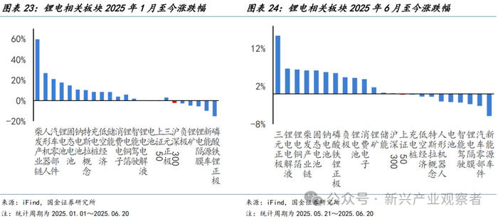 2025年6月以来,半数以上板块实现上涨,其中三元正极板块实现领涨,涨幅达15%,此外本月仍有部分板块呈现下跌态势,其中锂电隔膜、汽车零部件,新能源车板块下跌幅度分别为-3%、-3.2%、-5.9%。