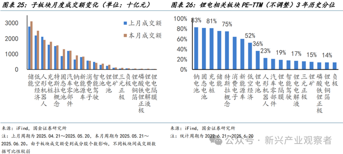 2025年6月以来,锂电板块表现较为活跃,超半数环节跑赢沪深300和上证50指数。三元正极板块实现领涨,涨幅为15%;部分板块呈现下跌态势,锂电隔膜、汽车零部件、新能源车板块下跌幅度分别为-3%、-3%、-6%。本月锂电相关板块多数环节月度成交额继上月大幅下降后开始快速回升,主要系固态电池等板块资金交易活跃。本月多数锂电相关板块处在3年历史估值分位底部,市场对锂电板块关注度回暖,未来存在进一步估值修复空间。