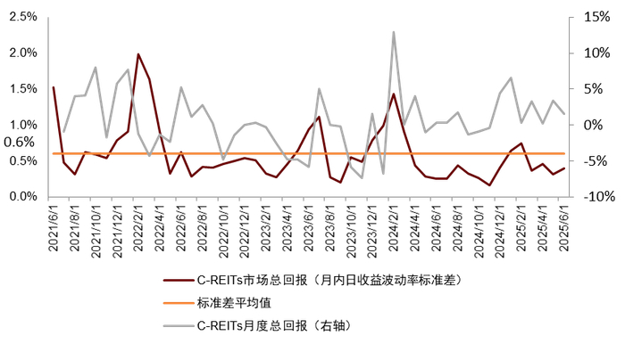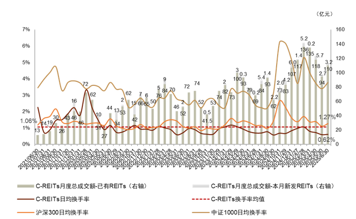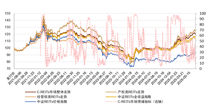 注:1)为了方便对比,我们对中证REITs价格指数及中证REITs全收益指数进行起始日期标准化调整;2)数据截至2025年6月30日;3)C-REITs市场情绪指标根据我们2023年3月24日发布的《公募REITs市场情绪初探》中描述的模型计算,并剔除了所有项目上市首日的换手数据