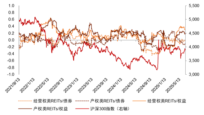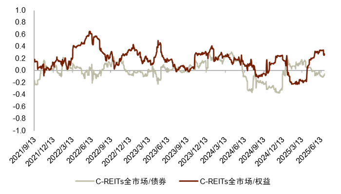 注:1)REITs与债券及权益的关系分别采用中债综合全价指数、沪深300指数计算;2)数据截至2025年6月30日