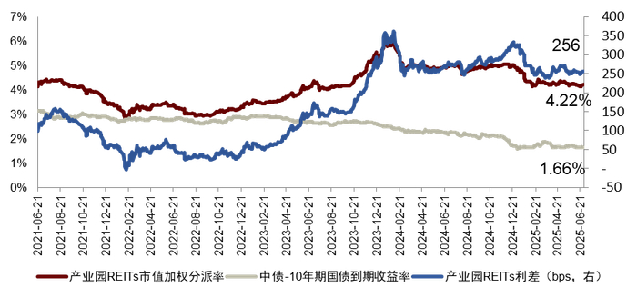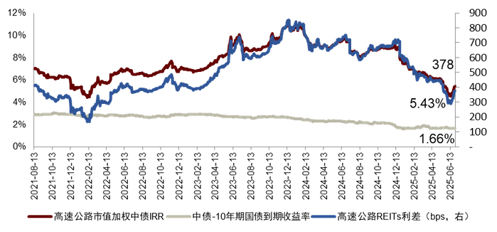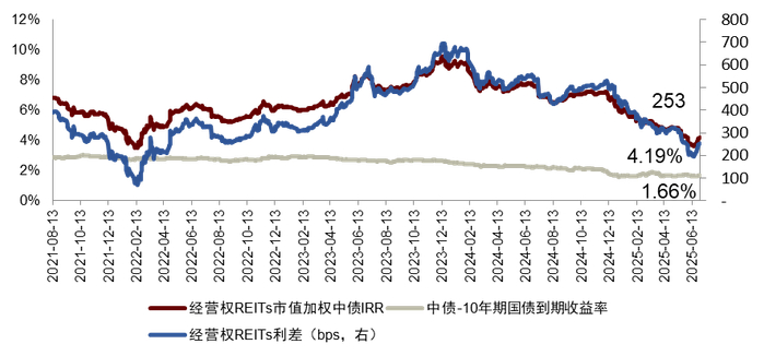 注:1)分派率(TTM)= 最近4个季报披露的单位可供分配金额之和除以市值,少于4个季报的项目的可供分配金额按招募书预期值;2)数据截至2025年6月30日;3)中债IRR数据起始日为2021年8月13日