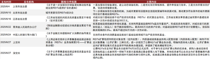 注:以上政策及文件依次来源于https://fgw.sh.gov.cn/fgw_czjrzhxt/20250604/66cbd8c03a7944ac89cb163ad0f557a1.html; https://fgw.beijing.gov.cn/gzdt/fzbjgzh/202506/t20250611_4110901.htm; https://drc.jiangxi.gov.cn/jxsfzhggwyh/col/col14590/content/content_1934453251415138304.html; http://www.qinghai.gov.cn/xxgk/xxgk/fd/zfwj/202506/t20250624_279298.html; https://www.gov.cn/lianbo/bumen/202506/content_7029284.htm; https://www.sse.com.cn/lawandrules/guide/reits/c/c_20250627_10783280.shtml; https://www.szse.cn/marketServices/technicalservice/notice/t20250627_614641.html。