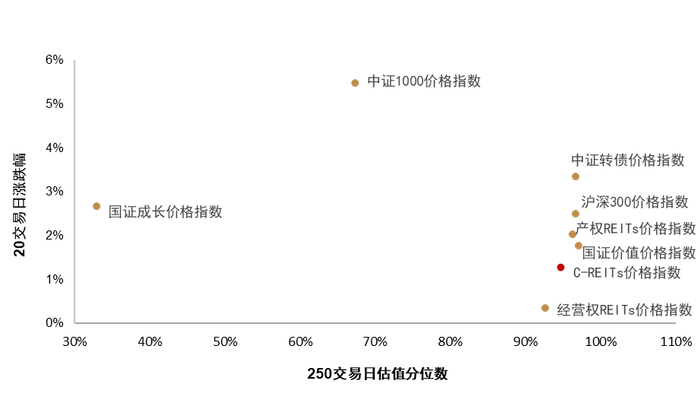 注:1)数据截至2025年6月30日;2)C-REITs估值为市值加权P/NAV,股指估值为P/E(TTM),可转债估值为百元溢价率