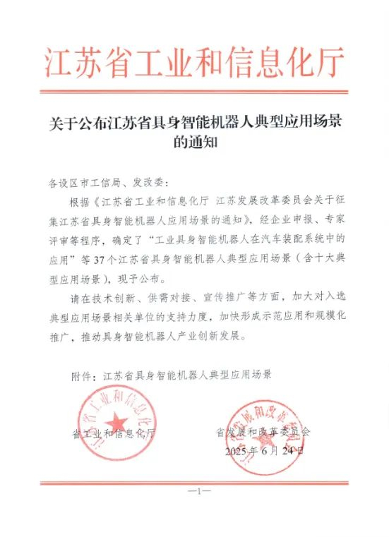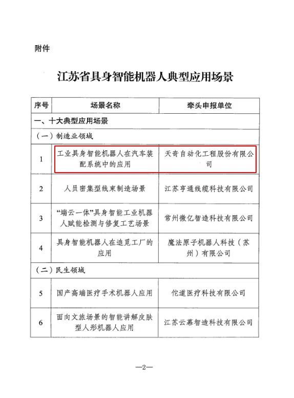 天奇股份“工业具身智能机器人在汽车装配系统中的应用”入选《江苏省具身智能机器人十大典型应用场景》